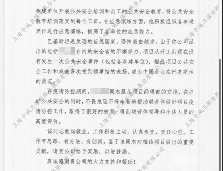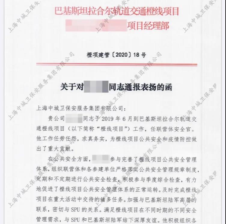 2020年4月,中城衛(wèi)保安集團收到橙項建管關于對中城衛(wèi)海外安全官通報的表揚函。信中指出,在中城衛(wèi)海外安全官任聯(lián)營體安全官期間,不斷攻堅克難,為橙線項目公共安全和疫情防控做出了重大貢獻。特別是在疫情大范圍爆發(fā)時,中城衛(wèi)海外安全官第一時間采取有效措施,迅速做出應對工作,保證了項目工作人員的安全。